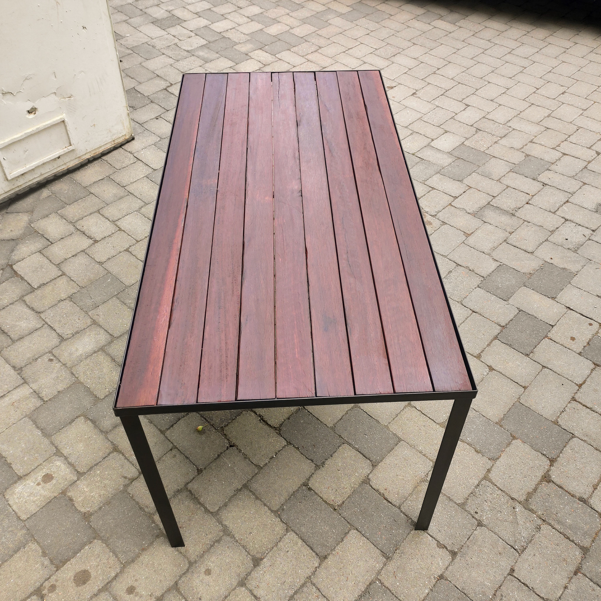 Två olika sorts trädgårdsbord. Den ena i hårdvaxad furu som är lämplig att stå ute men under tak. Den andra i det vackra röda azobé - ett trä som är i princip helt beständigt mot vatten, här med underrede i stål.